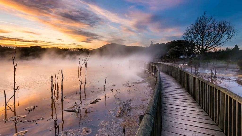 The geothermal city of Rotorua is a magnet for travelers, who come to discover volcanic phenomena and learn about New Zealand’s Maori culture. Rotorua is part of the Volcanic Zone, a geothermal field extending from White Island off the Bay of Plenty coast to Mount Ruapehu in the central North Island.