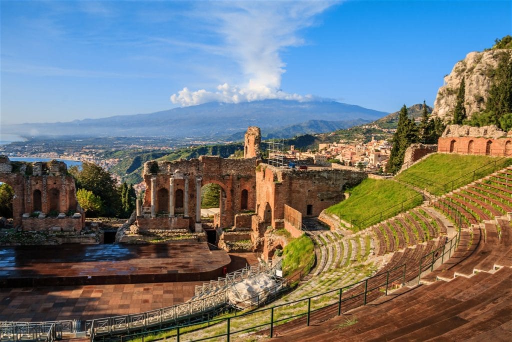 Sicily’s legendary resort town Taormina, with volcanic Mount Etna and the Ionian sea providing the cinema worthy backdrop, is one of Sicily’s most popular summer destinations, a chi-chi resort town popular with holidaying high-rollers and those wanting a taste of Sicilian dolce vita. Sicily – the largest island in the Mediterranean Sea is the home of Mount Etna, The Godfather and lovely Taormina featuring an unbelievable landscape, lovely beaches, and precious ancient remains. Taormina is a popular and fashionable tourist resort with famously stunning views and a picturesque Graeco-Roman theatre, high above the sea and facing the volcanic and still active Mount Etna.