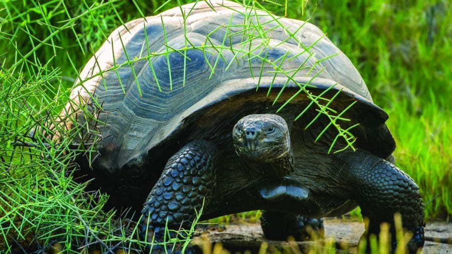 The Galapagos giant tortoise is arguably the most famous species inhabiting the island. They can weigh up to 450 pounds and typically live for over 100 years. They are docile creatures, known to lumber along, sunbathe and nibble at vegetation.